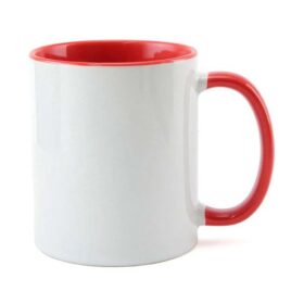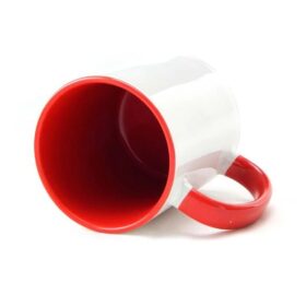 – Material da caneca: cerâmica branca, alça vermelha e interior vermelho.